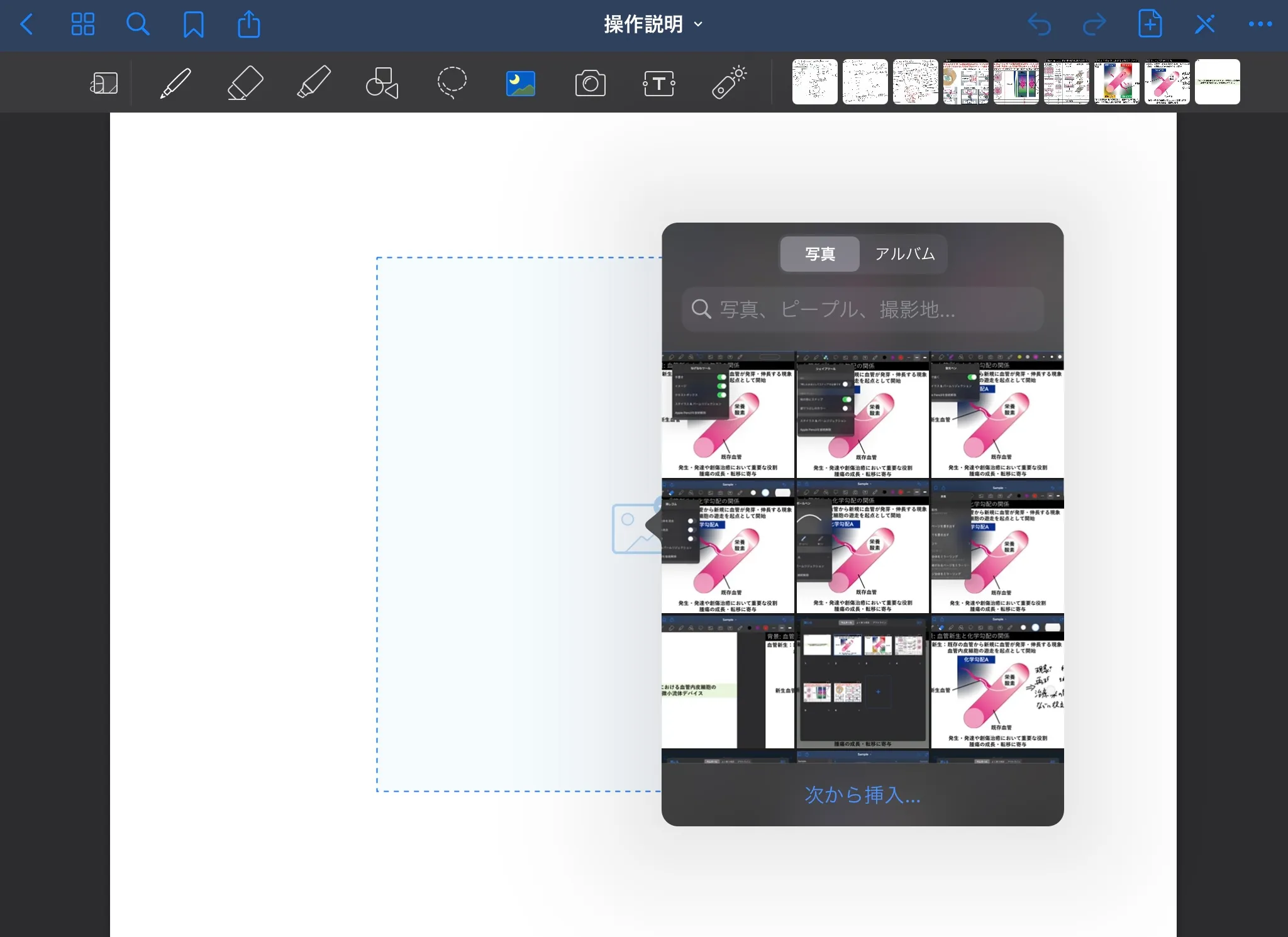 デバイス上の画像を選択して,挿入できるツールです.iPad上の「フォト」や「ファイル」から選択可能です. 画像ツールをクリックすると表示されるカメラツールを使用すれば,その場で撮影した写真を挿入することができます.