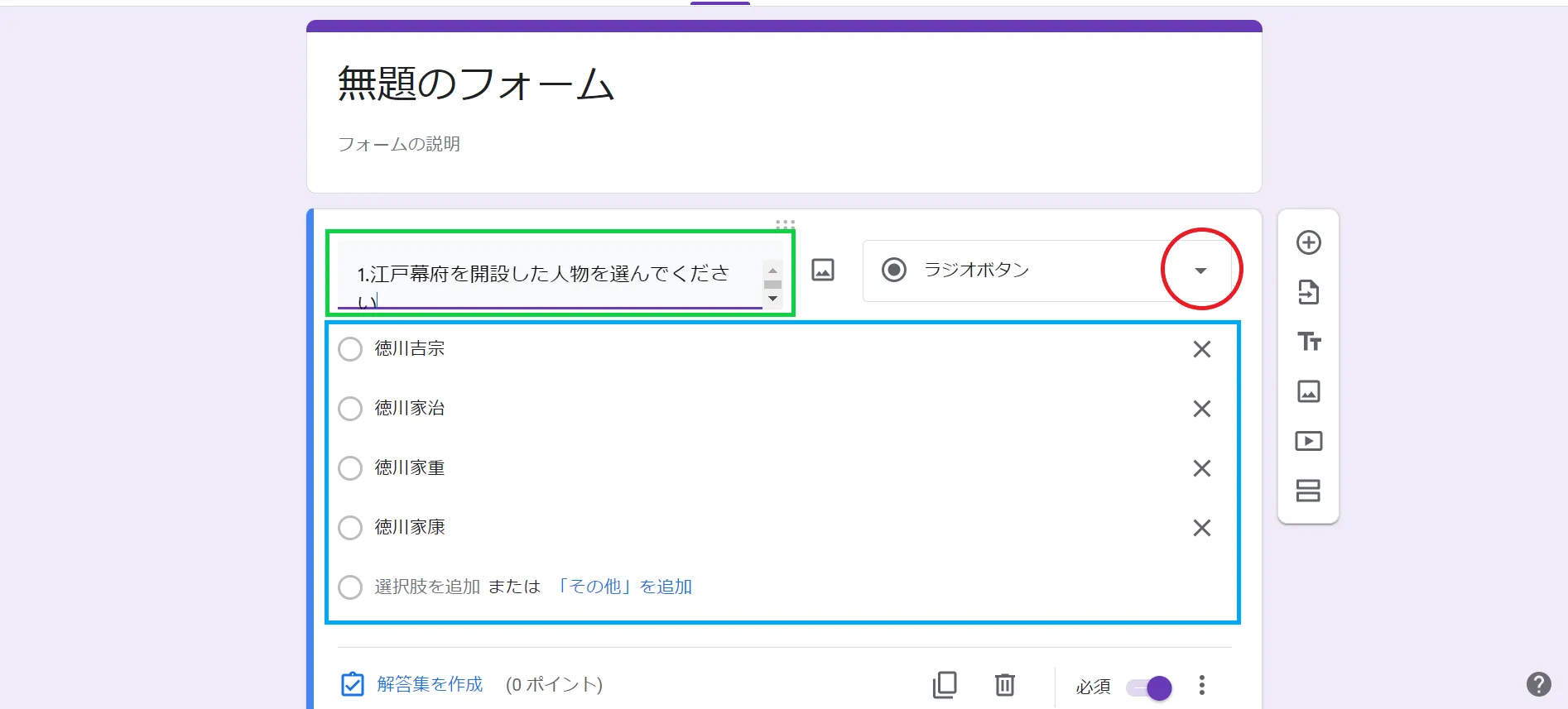 設問フォームの右側の下⽮印のアイコン(下図赤丸)をクリックし,「ラジオボタン」を選択します.下図の緑の枠内に問題を,⽔⾊の枠の部分に解答の選択肢を⼊⼒します.
