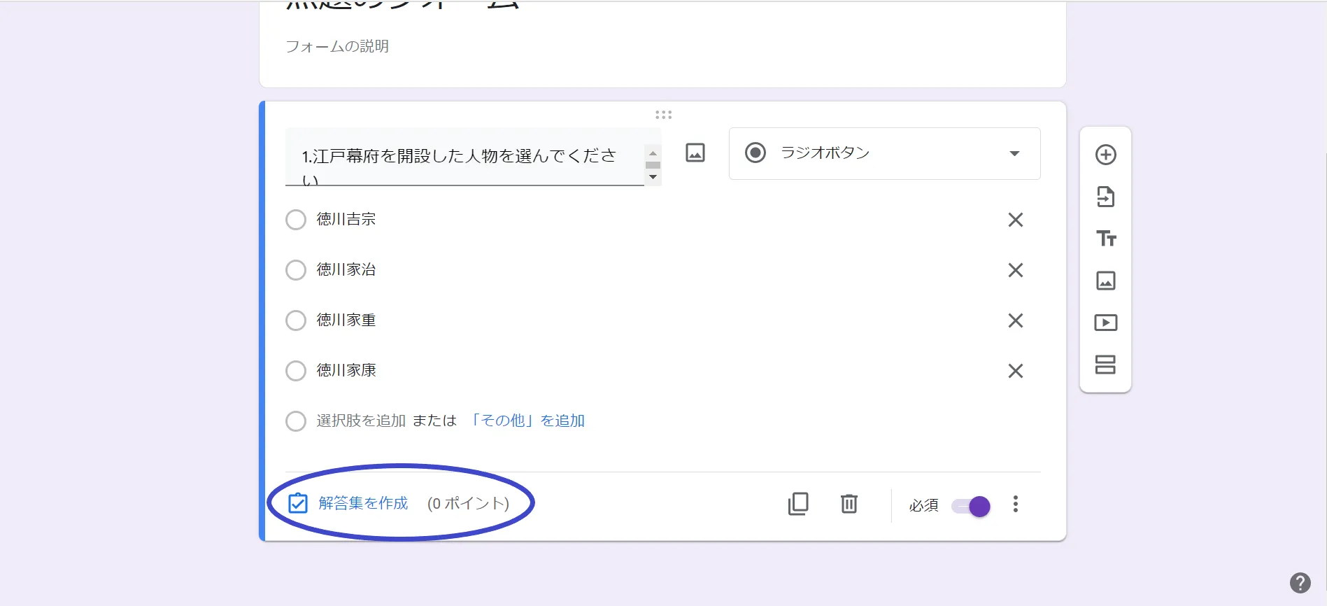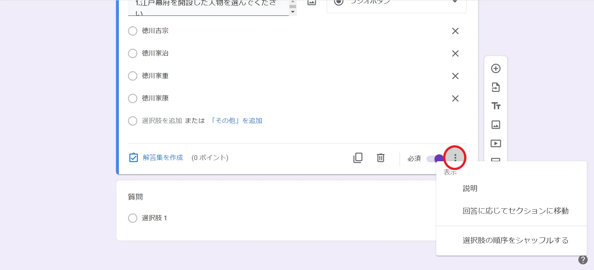 下図右下の⾚丸で囲われたアイコン「︙」から,「選択肢の順序をシャッフルする」こともできます.