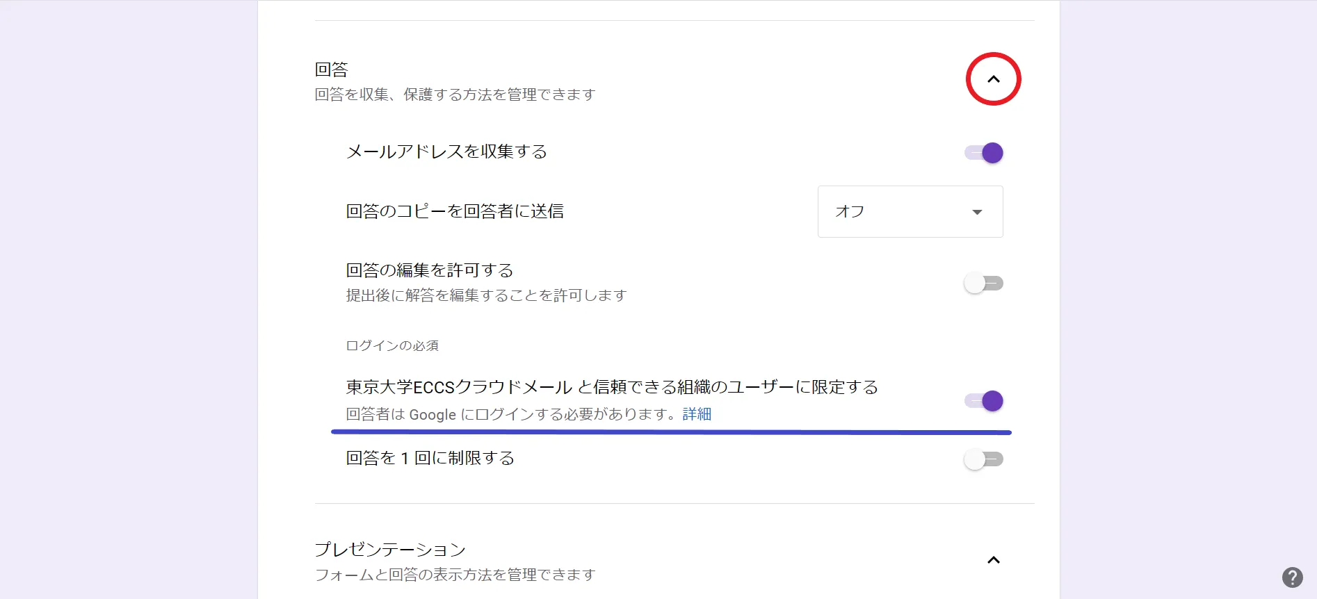フォームの回答者を学内構成員(ECCSクラウドメールのアカウント保有者)のみに制限したい場合