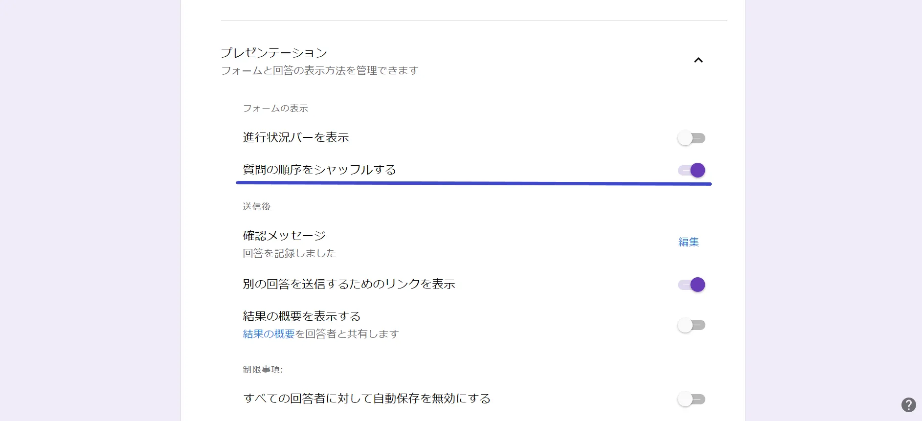 上のバーの「設定」をクリックし,「プレゼンテーション」から「質問の順序をシャッフルする」をオンにすることで,テスト問題自体をシャッフルすることもできます(不正防止の手段として,テスト問題のシャッフルは有効です).