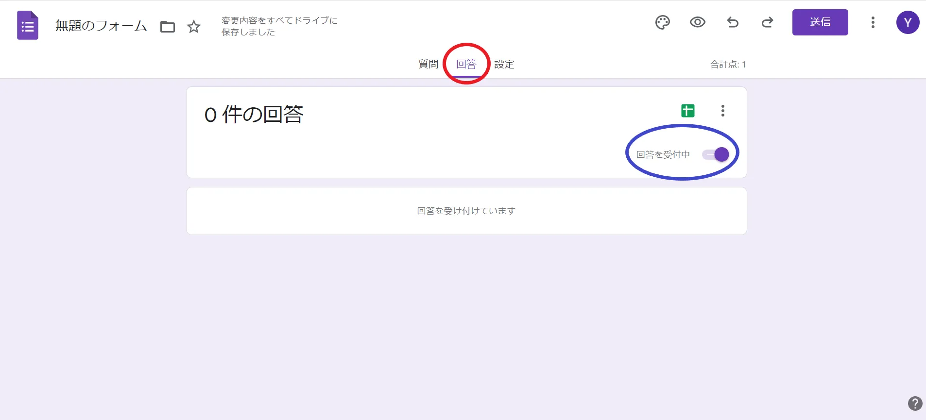 制限時間が終了したら,上図赤丸の「回答」をクリックし,「回答を受付中」をオフにすることで回答を終了することができます.