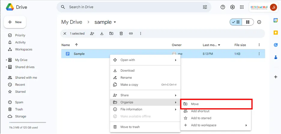 1. Please right-click the file you wish to move and select “Organize” → ”Move” in the context menu that appears.