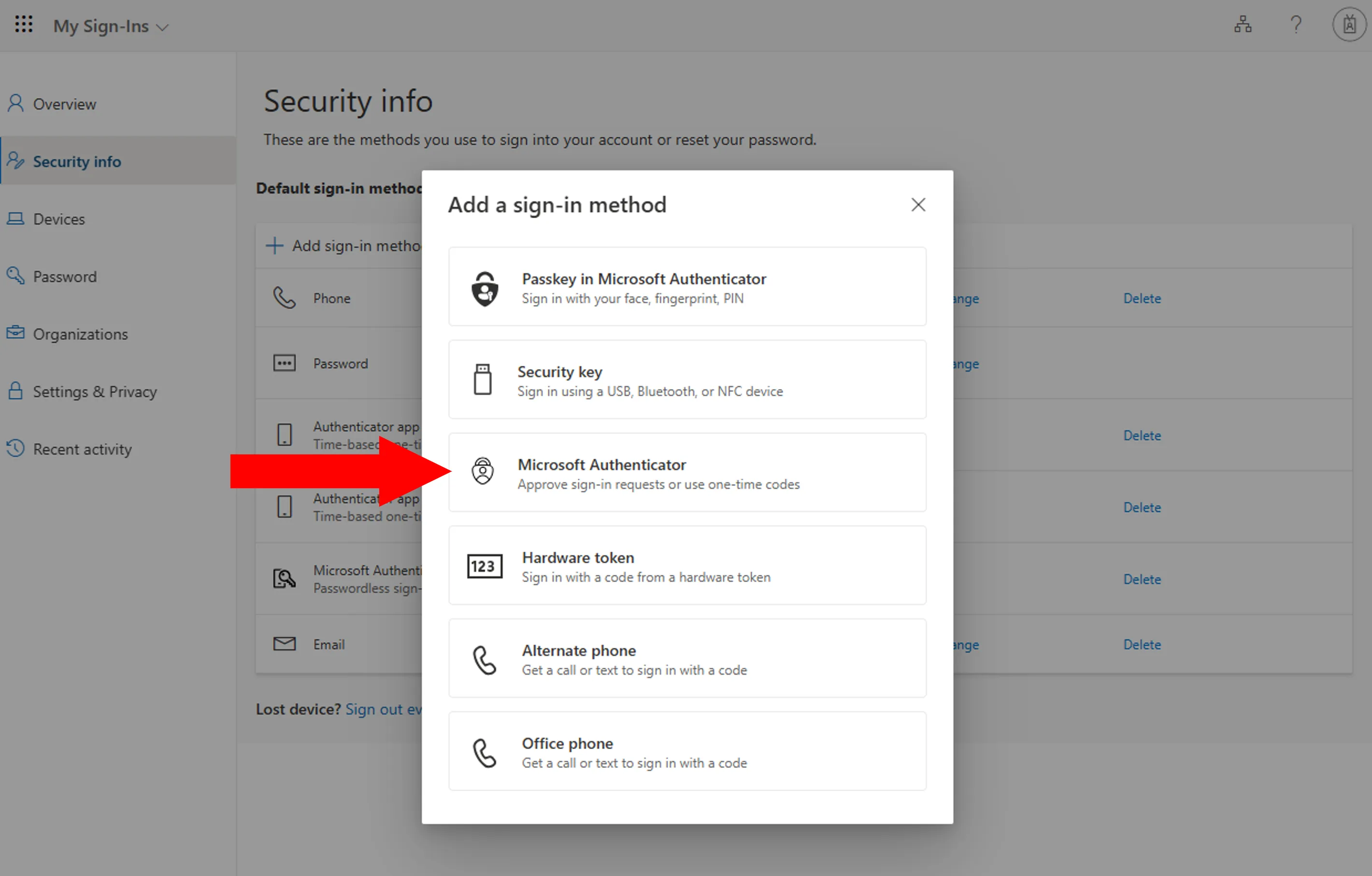 Next, add alternative verification methods (second and subsequent methods) from the Security info page.