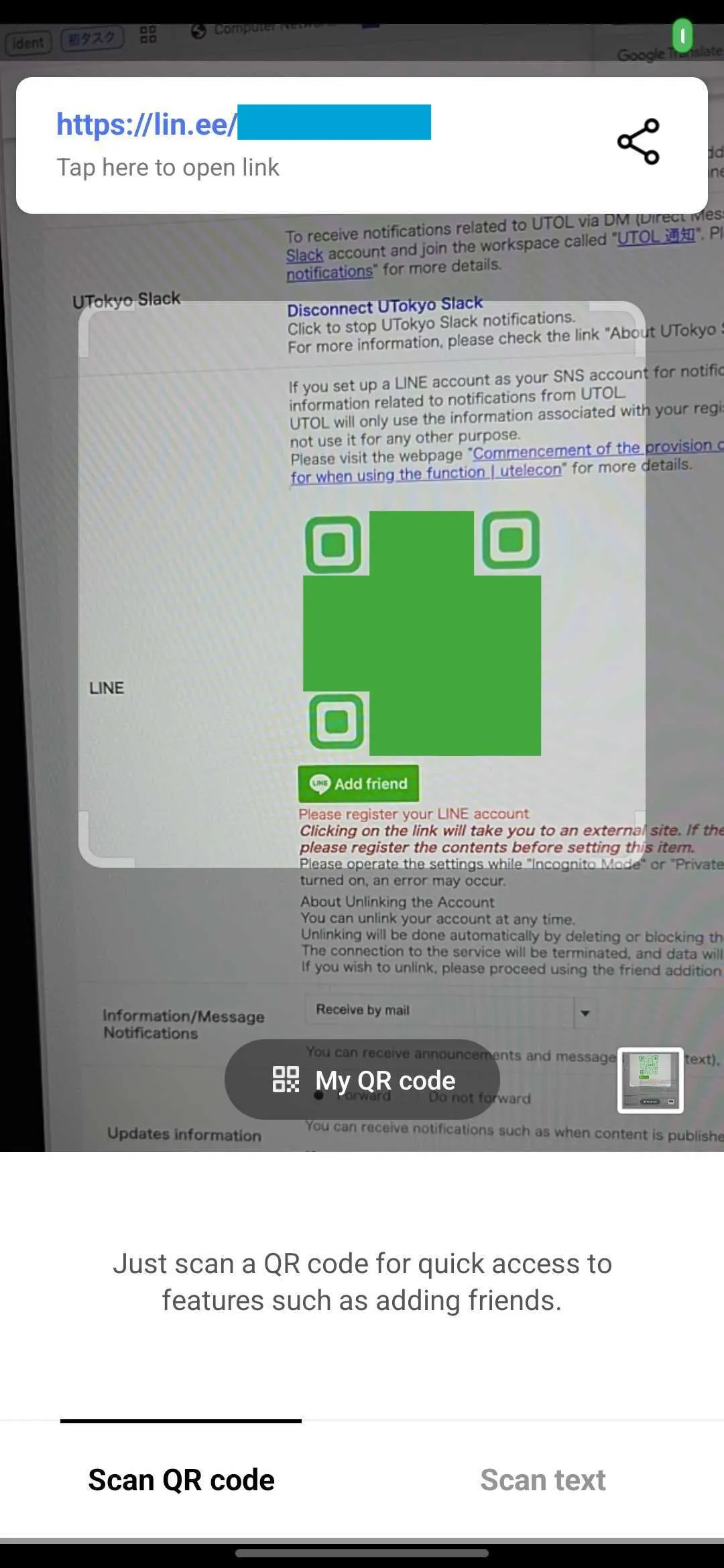 Please make sure the message “LINE is now linked with 東京大学UTOL.” has been displayed.