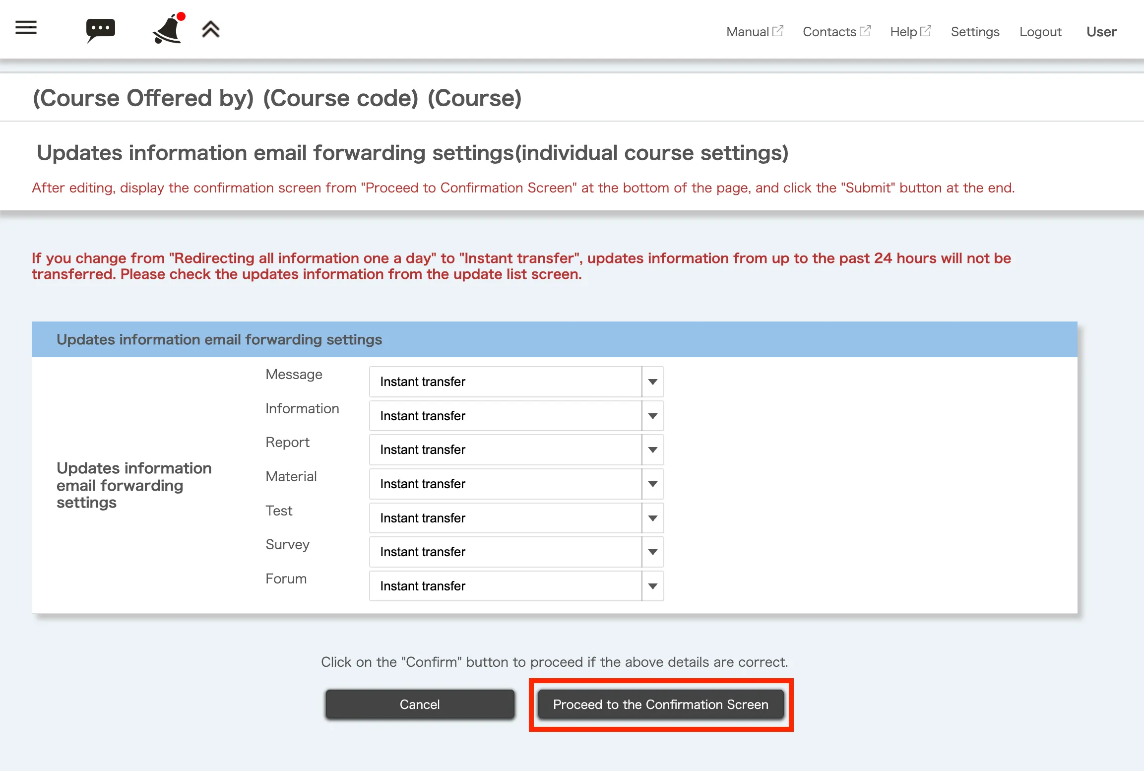 ※1. When forwarding to LINE, the “Instant transfer” of update information for assignments, course materials, quizzes, surveys, and forums are not available. Only the “Redirecting all information once a day” option is available (you can also select “Do not forward”).