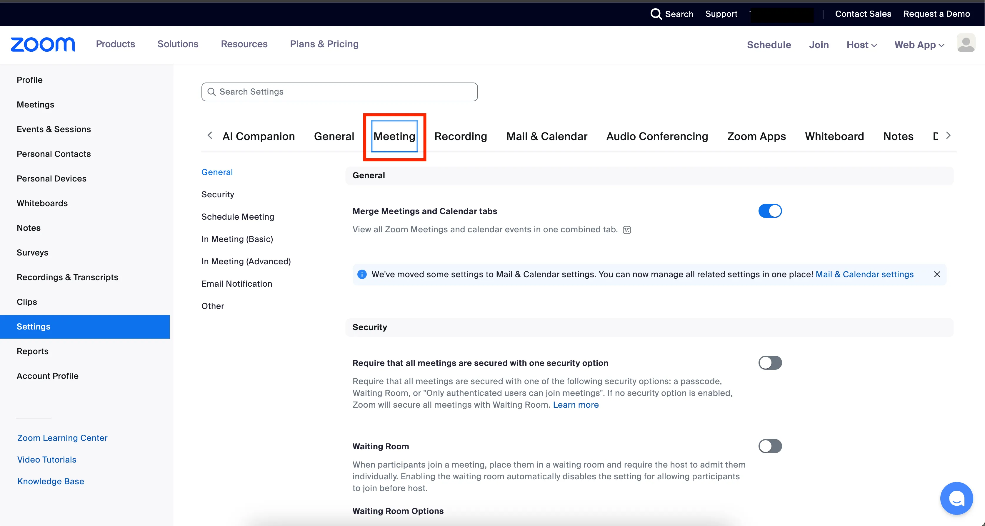 The settings for these features can be accessed by selecting the “Meeting” tab from the top section of the “My Settings” page.