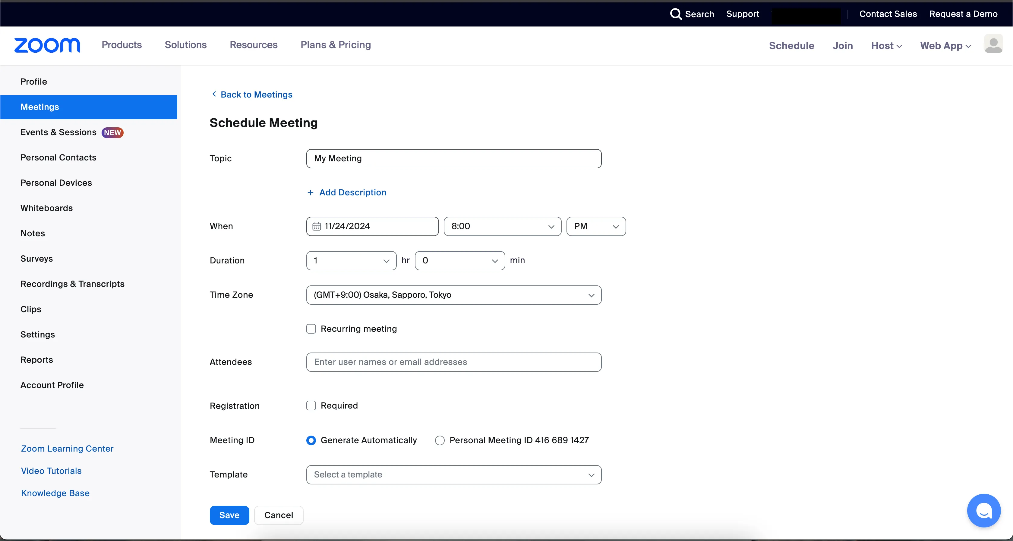 When “Generate Automatically” is selected, a new meeting ID will be automatically generated and assigned to the meeting being created. On the other hand, if the “Personal Meeting ID” is selected, a unique number assigned to each user (the “Personal Meeting ID”) will be used as the meeting ID.