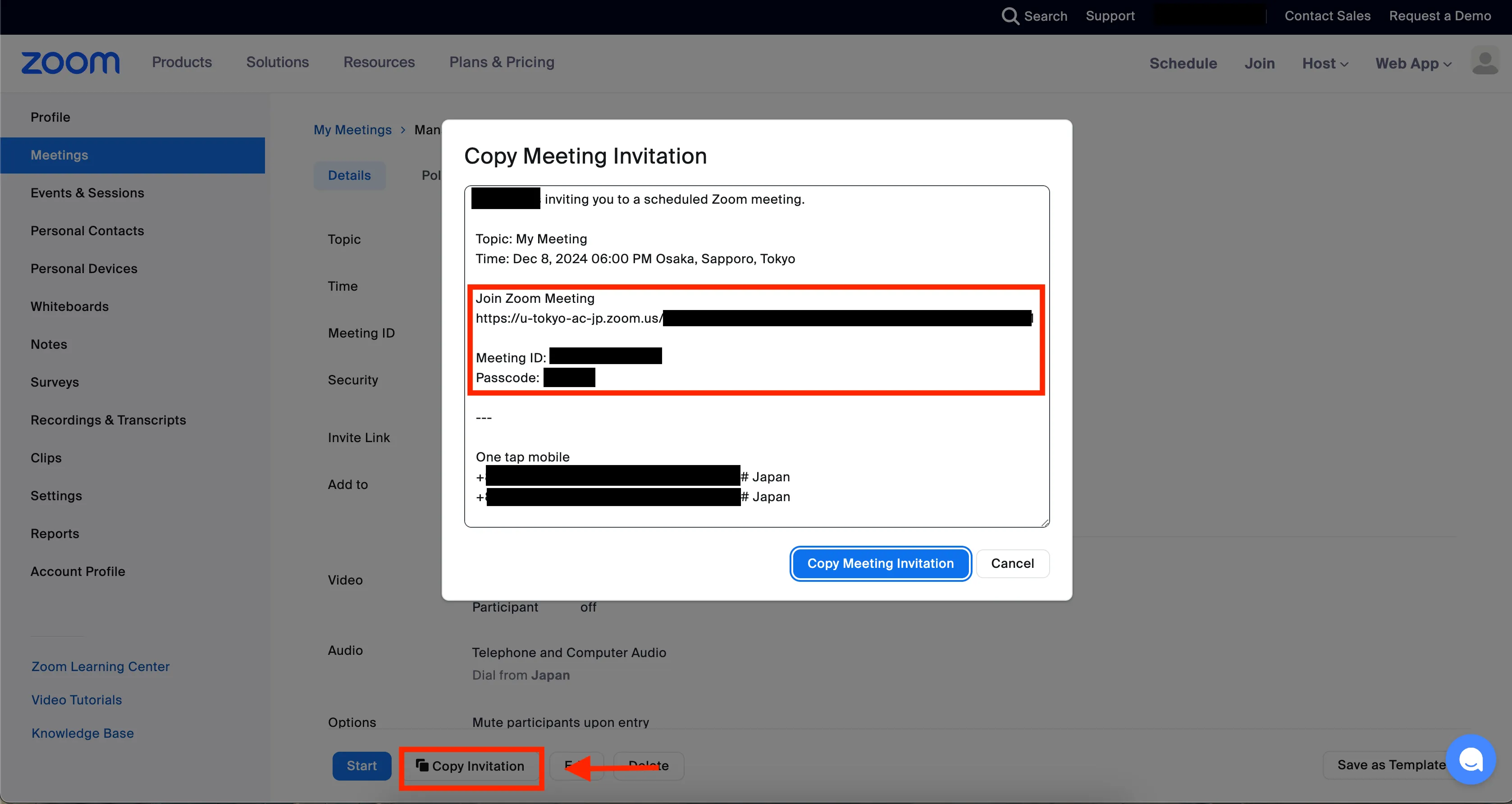 • Select the “Copy Invitation” button displayed on the screen in Step 5 and share the content of the displayed screen with the participants. For simplicity and convenience, it is especially helpful to extract and share just the Invitation Link, Meeting ID, and Passcode.