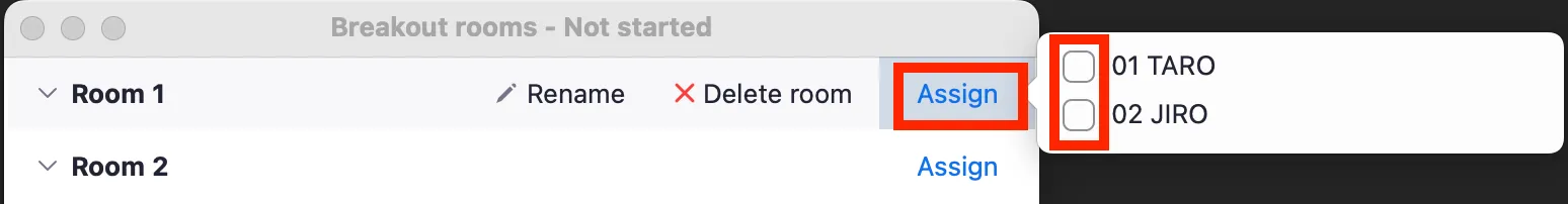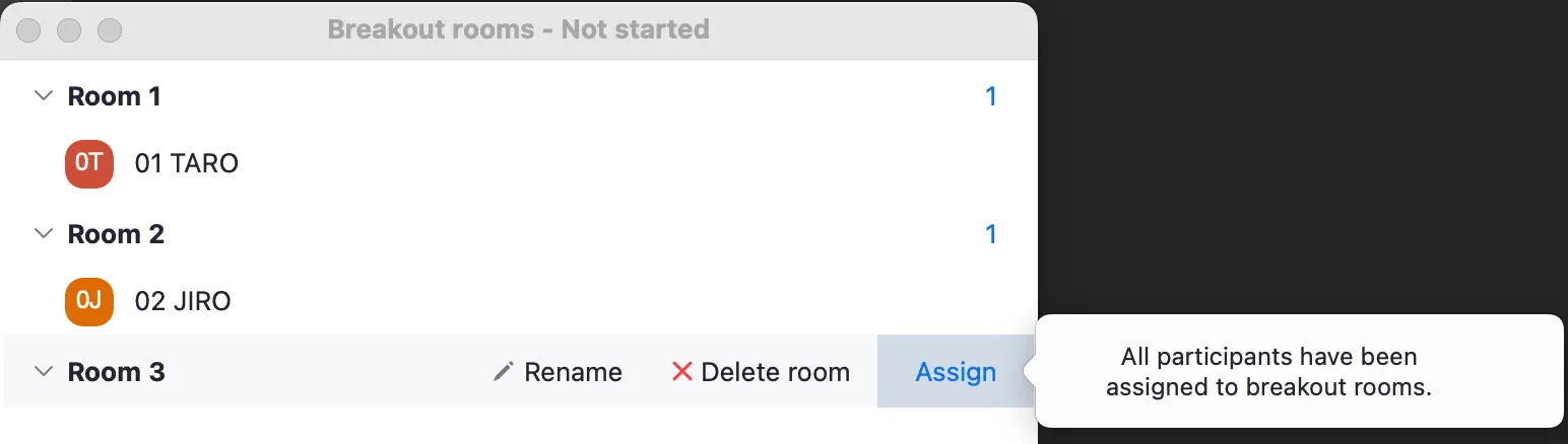 If you create the exact number of rooms needed, you have to sum up the participant count next to each room to check if everyone has been assigned. By creating one extra room, you can more easily prevent omissions. After completing the assignments, if you try to assign someone to the extra room, a message will appear stating, “All participants have been assigned to breakout rooms.”, making confirmation easy.