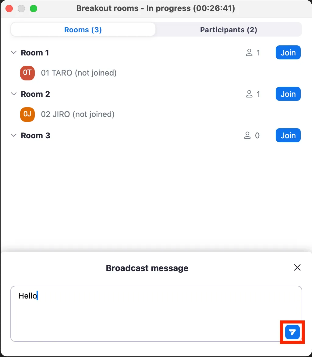 • To broadcast a message: Type the message you want to send and then click the broadcast icon (the icon in the red box in the figure). The sent message will be displayed in each breakout room for 10 seconds and then disappear.