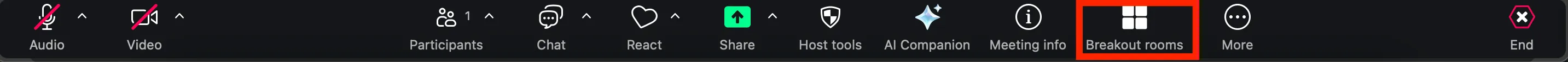 1. Click “Breakout Rooms” at the bottom of the meeting screen (if not visible, click “More” to display it).