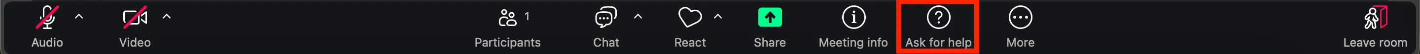 1. From the bottom of the meeting screen, click “Ask for help” (if not visible, select “More” to display it).