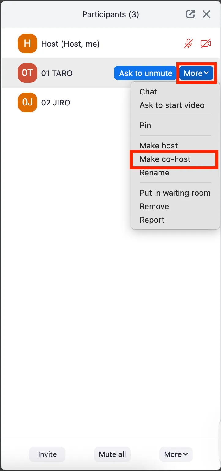 If a problem occurs in a breakout room, a participant can ask the host for help and request that they join the breakout room. It is also possible to send a chat message to the host, but this might be missed. Therefore, when you want to call the host, it is better to send a help request.