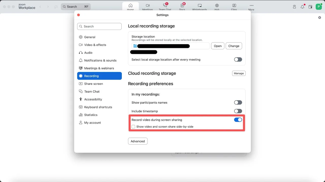 - To place shared content and videos without overlapping: Check “Show video and screen share side-by-side”.
