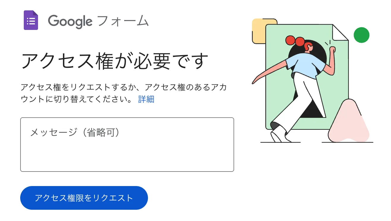 • 任意でメッセージを入力し,「アクセス権限をリクエスト」ボタンから権限をリクエストすると,フォームのオーナーに通知されます.