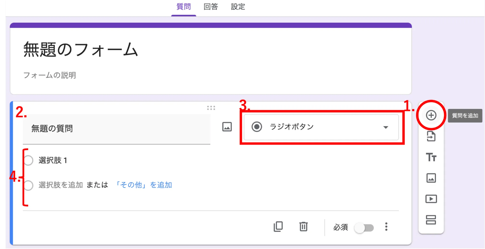4. 選択式の回答形式においては,選択肢の設定を行ってください.