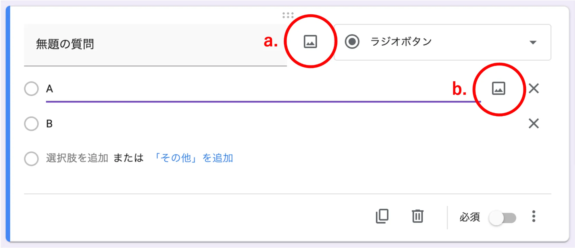 • 質問の内容を補足するために,質問文の右側のボタン(a.)からは質問文に,選択肢の右のボタン(b.)からは選択肢に画像を添付することができます.