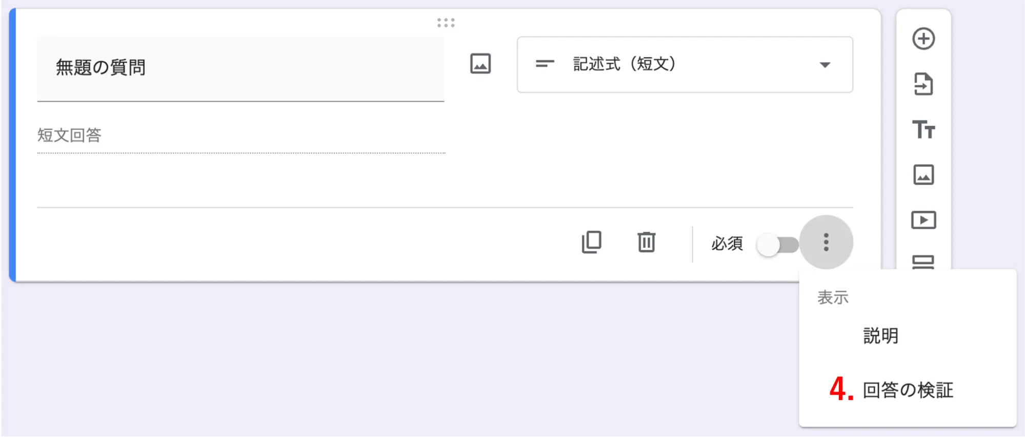 • 回答方法が記述を伴うもの,チェックボックス式である場合,「回答の検証」ボタンから回答の際のルール(「値が整数値でなければエラーを出力する」など)を設定することができます.