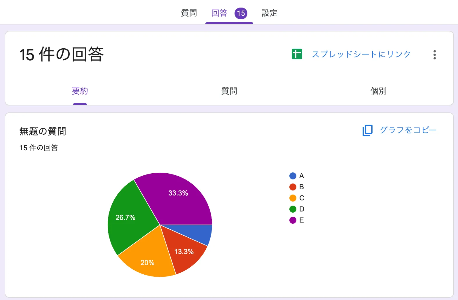 フォームを編集することができる「質問」タブを「回答」タブに切り替えると,質問ごとまたは個別の回答ごとに回答を確認することができます.また,結果に応じてグラフなどの可視化ツールを自動で用いることができます.