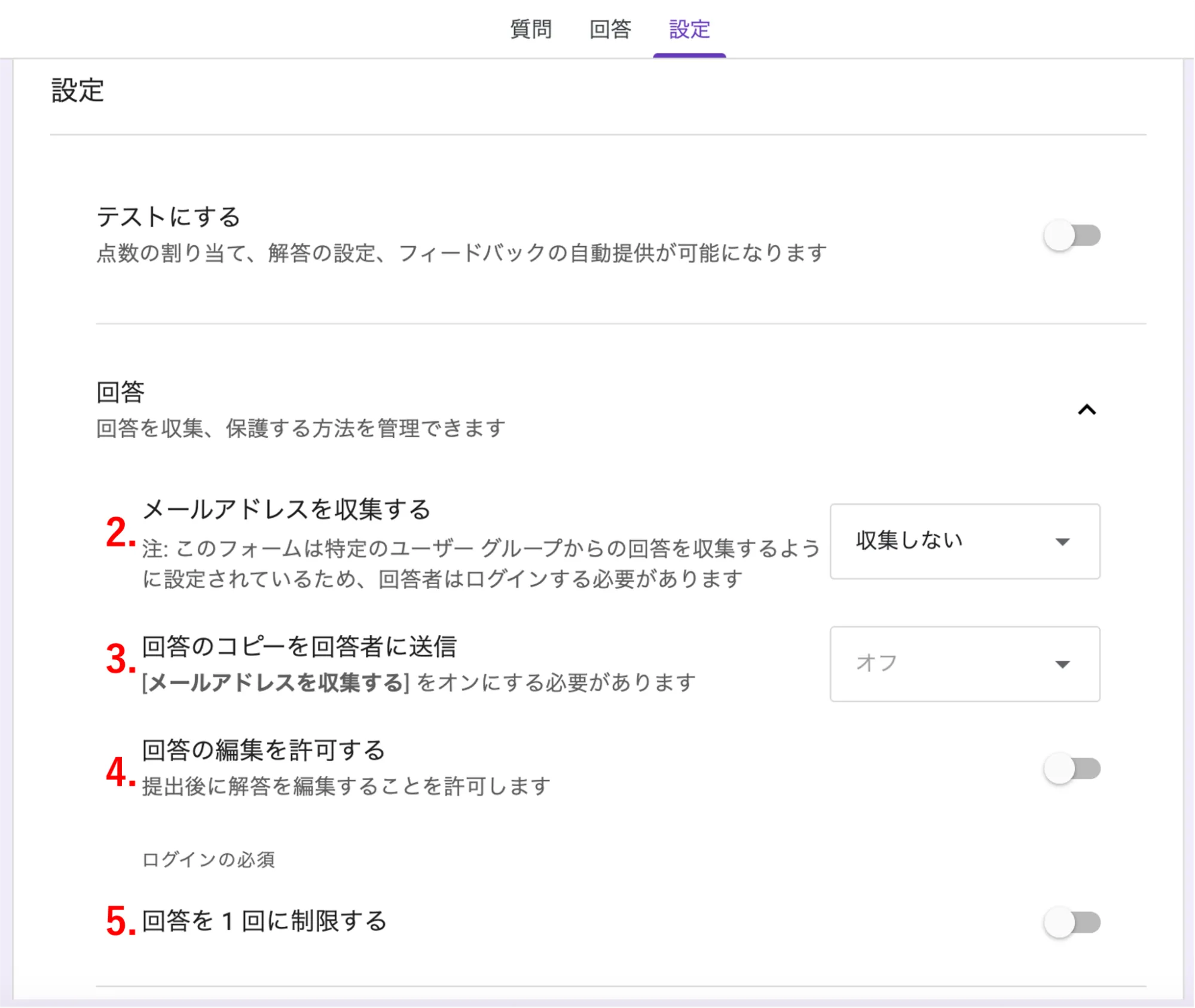 • 「確認済み」を選択する場合,回答者はGoogleアカウントでログインした状態でフォームに回答する必要があり,ログインしていない状態ではログインが求められます.「回答者からの入力」を選択する場合は,ログインの必要はありません.