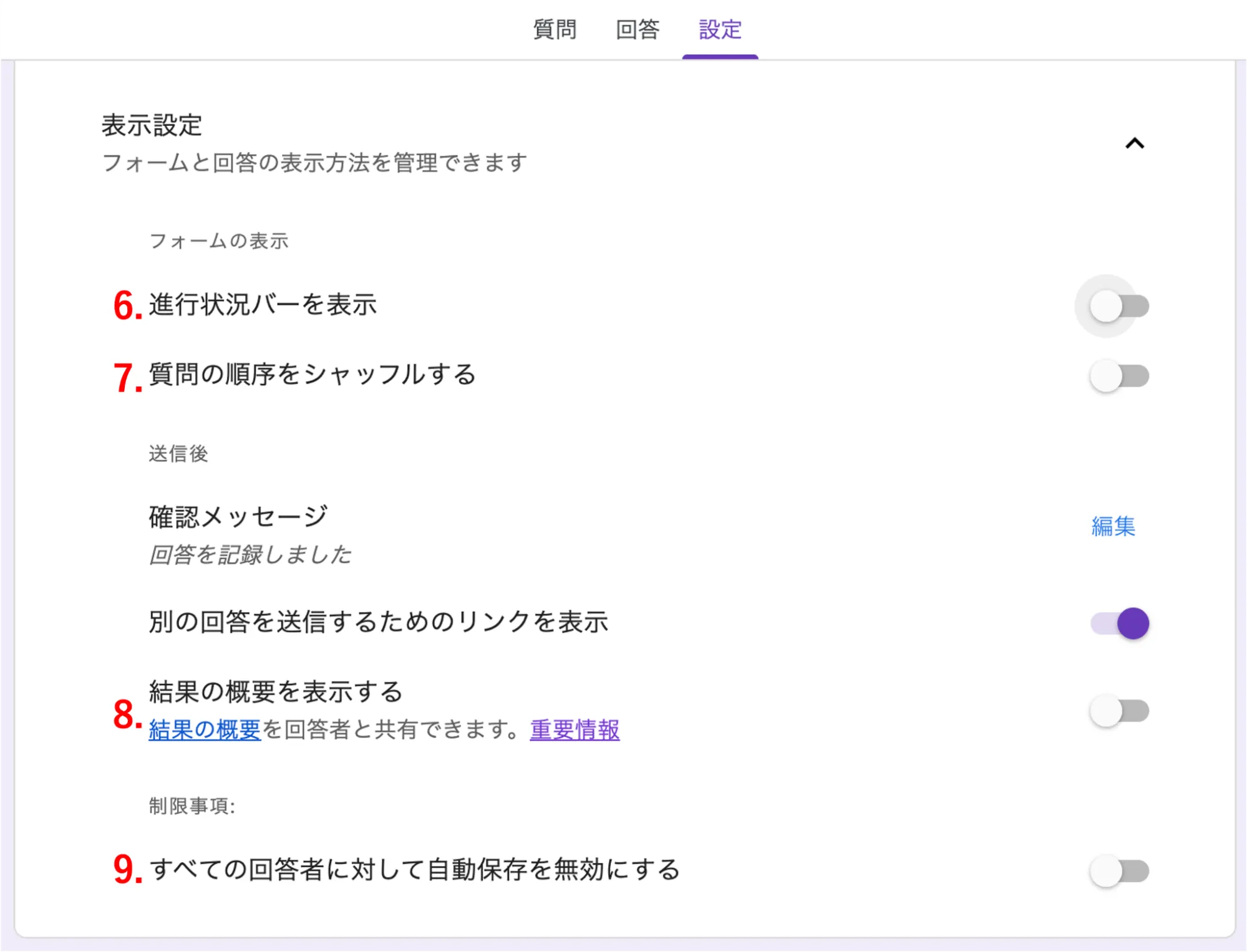 • 「回答の編集を許可する」をオンにすると,回答者が回答を送信した後でも,回答送信後の画面に表示されるリンクにアクセスすると,送信した回答を編集することができるようになります.ただし,編集することができるのは「回答の受付を終了」するまでです.