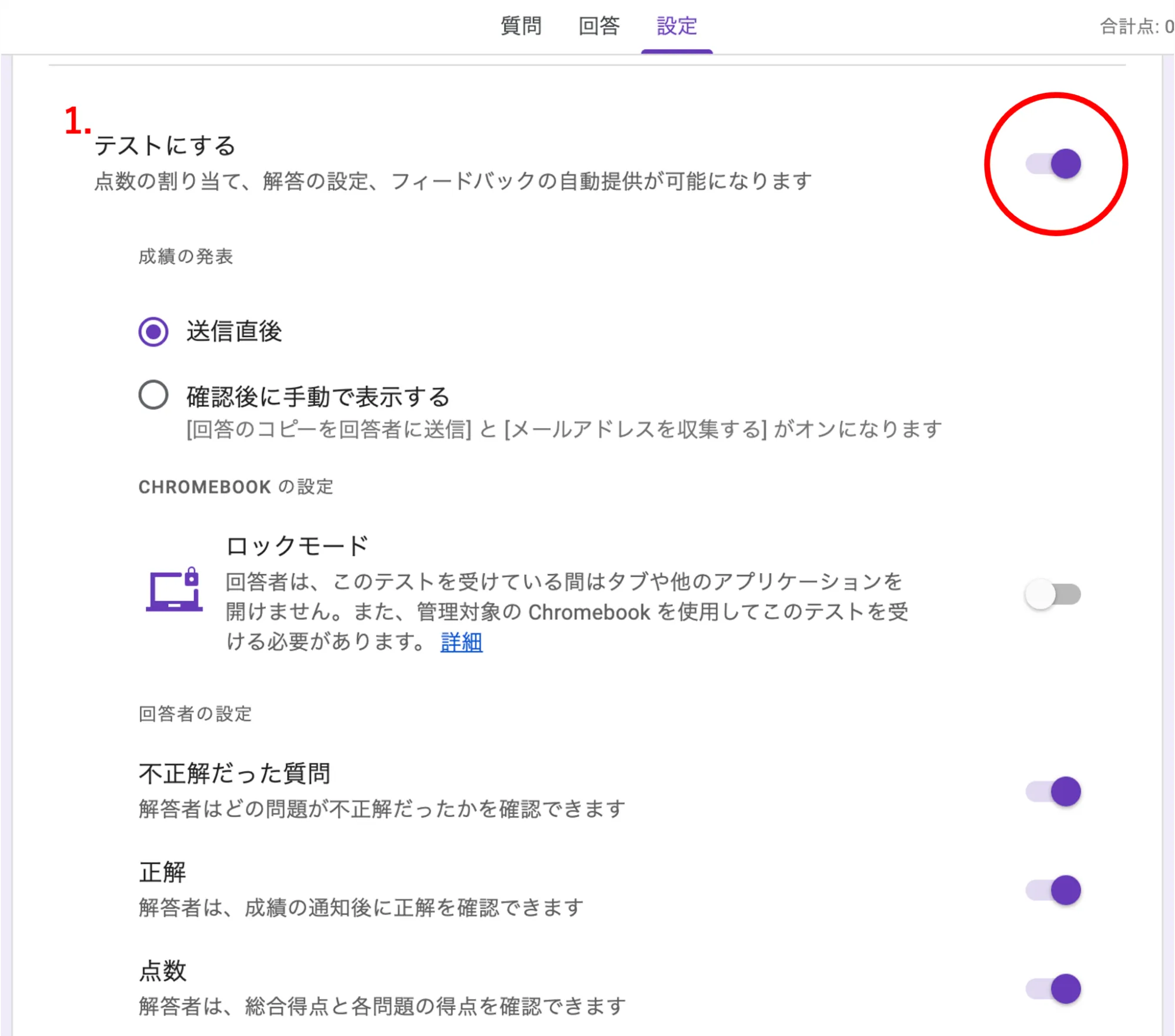 • 小テストなどにGoogleフォームを利用したいときは,設定タブの「テストにする」をオンにすることで,テストとして利用することができます.テスト機能を用いることで,各々の質問に対し配点と模範解答を設定し,それに基づいた成績を回答者に知らせる採点機能を利用することができるようになります.
