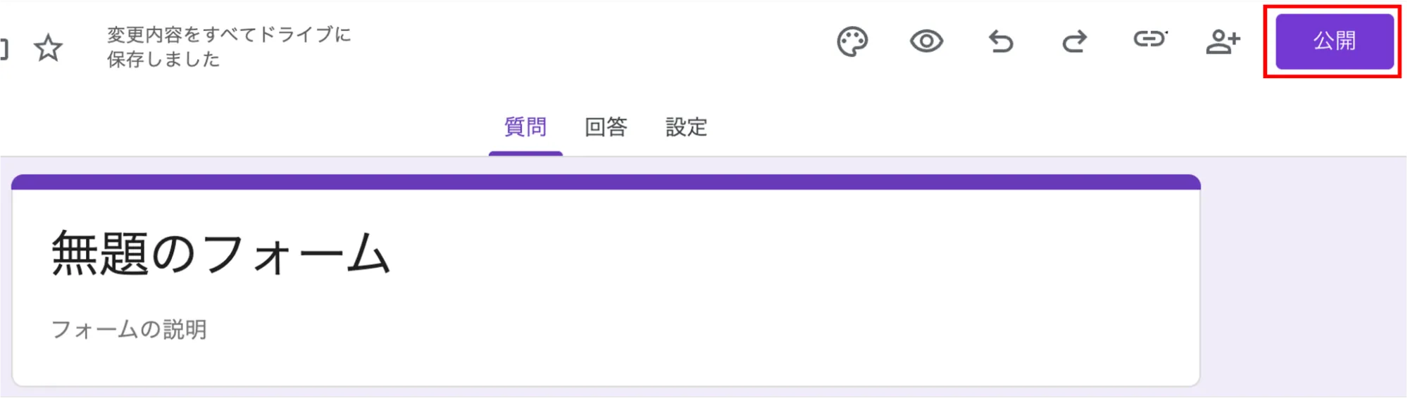 ページ右上の「公開」ボタンから,フォームを回答できる状態に公開することができます.
