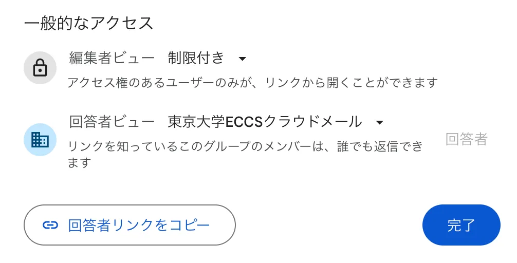 編集者・回答者のそれぞれの「制限付き」「東京大学ECCSクラウドメール」などの権限が書かれているボタンを押すことで,フォームに回答することができる人の範囲を変更することができます.