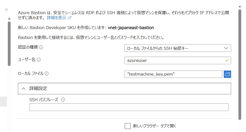 • ローカルファイル:ssh 秘密鍵が含まれているファイルをここに選択してください.この例では,仮想マシン構成時に新規にtestmachine_key.pemという鍵を作成,ダウンロードしている想定です.