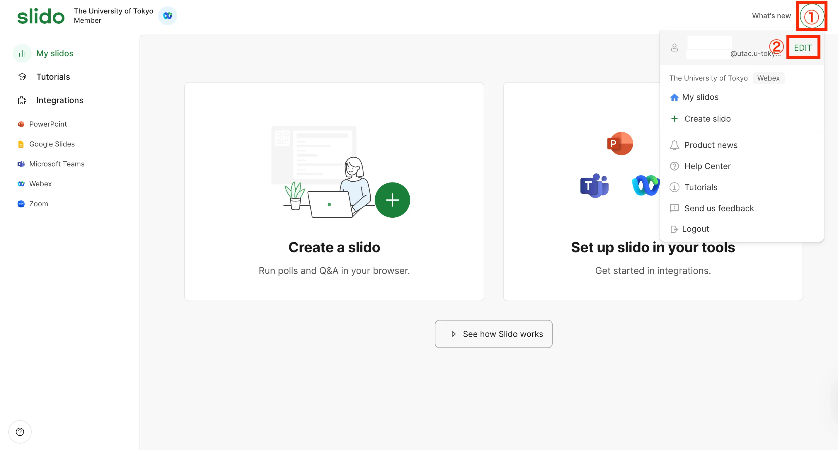 Slidoには,個人のアカウントを利用してサインインすることもできますが,以下の手順に従ってUTokyo Accountでサインインすることで,有料機能を利用できるようになります(※UTokyo Accountをまだ使ったことがなければ,先に「UTokyo Accountを使い始めるには」を参照してください.)
