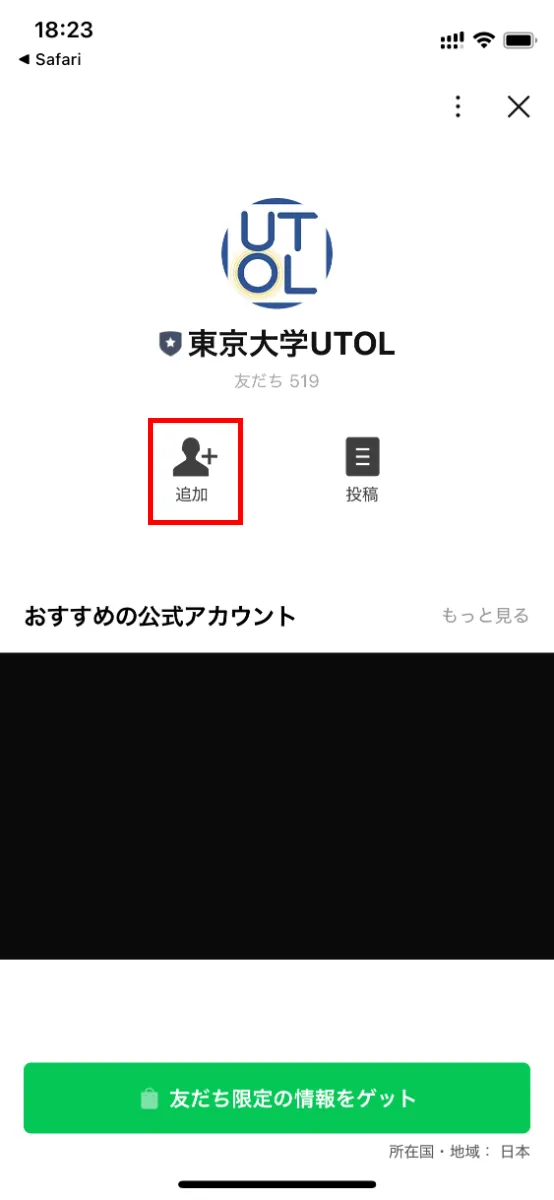 2. 「公式アカウント」タブから探すか,検索窓に「東京大学 UTOL」と入力し,「東京大学 UTOL」を長押ししてください.