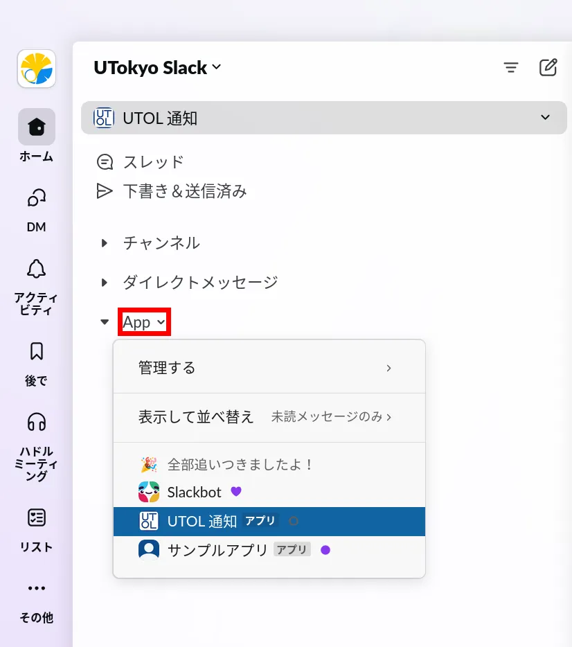 • 通知は,「UTOL 通知」(Slack App)からダイレクトメッセージで送信されます.Slack Appとのダイレクトメッセージは,「App」メニューの「UTOL 通知」を押すと,開くことができます.