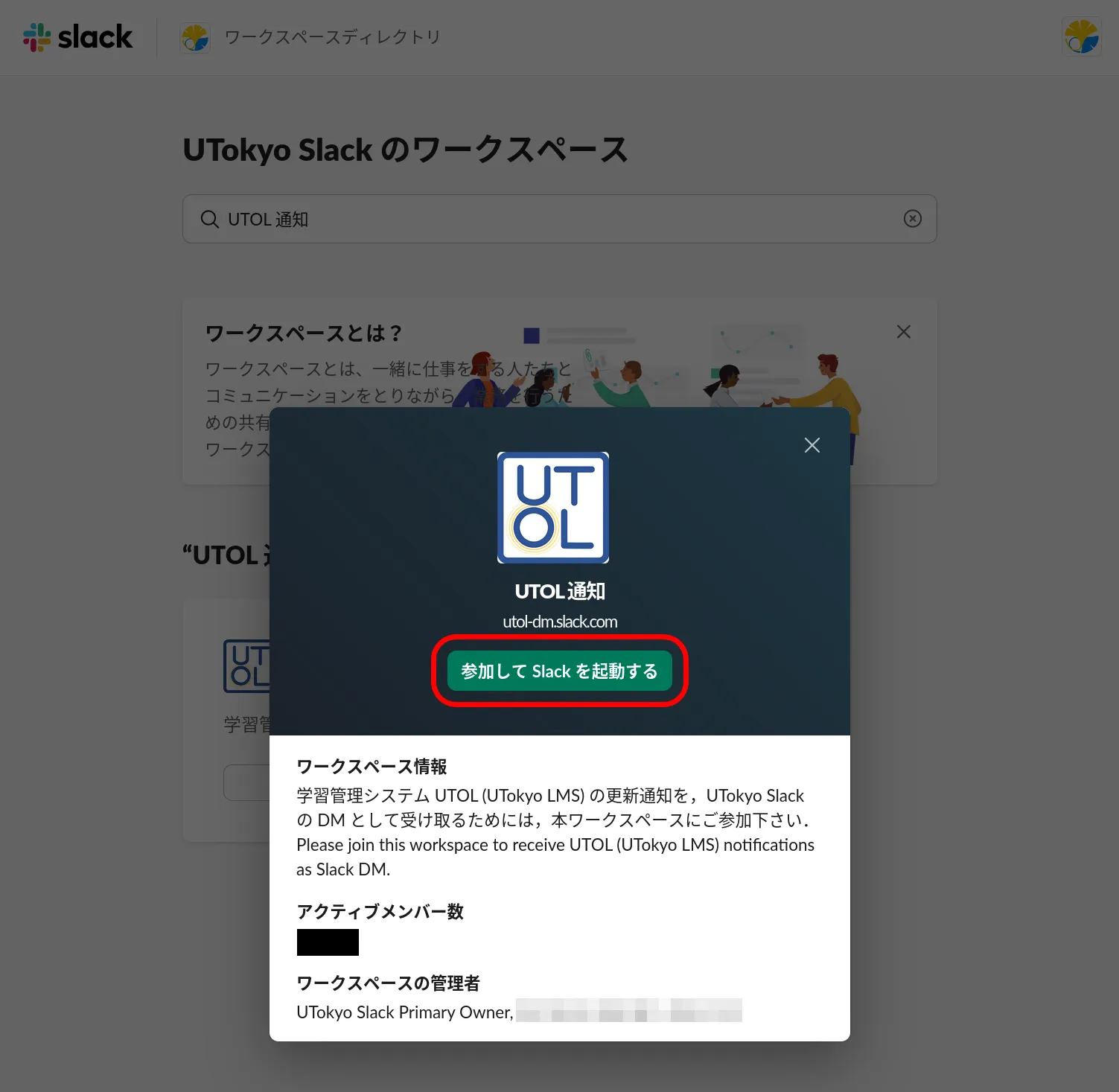 5. 参加が完了すると,ワークスペースの画面が表示されます.画面左上,ワークスペース名が表示されているプルダウンリストを開き,図のように展開されるリストの中に「UTOL 通知」が含まれていることを確認してください. ワークスペース一覧