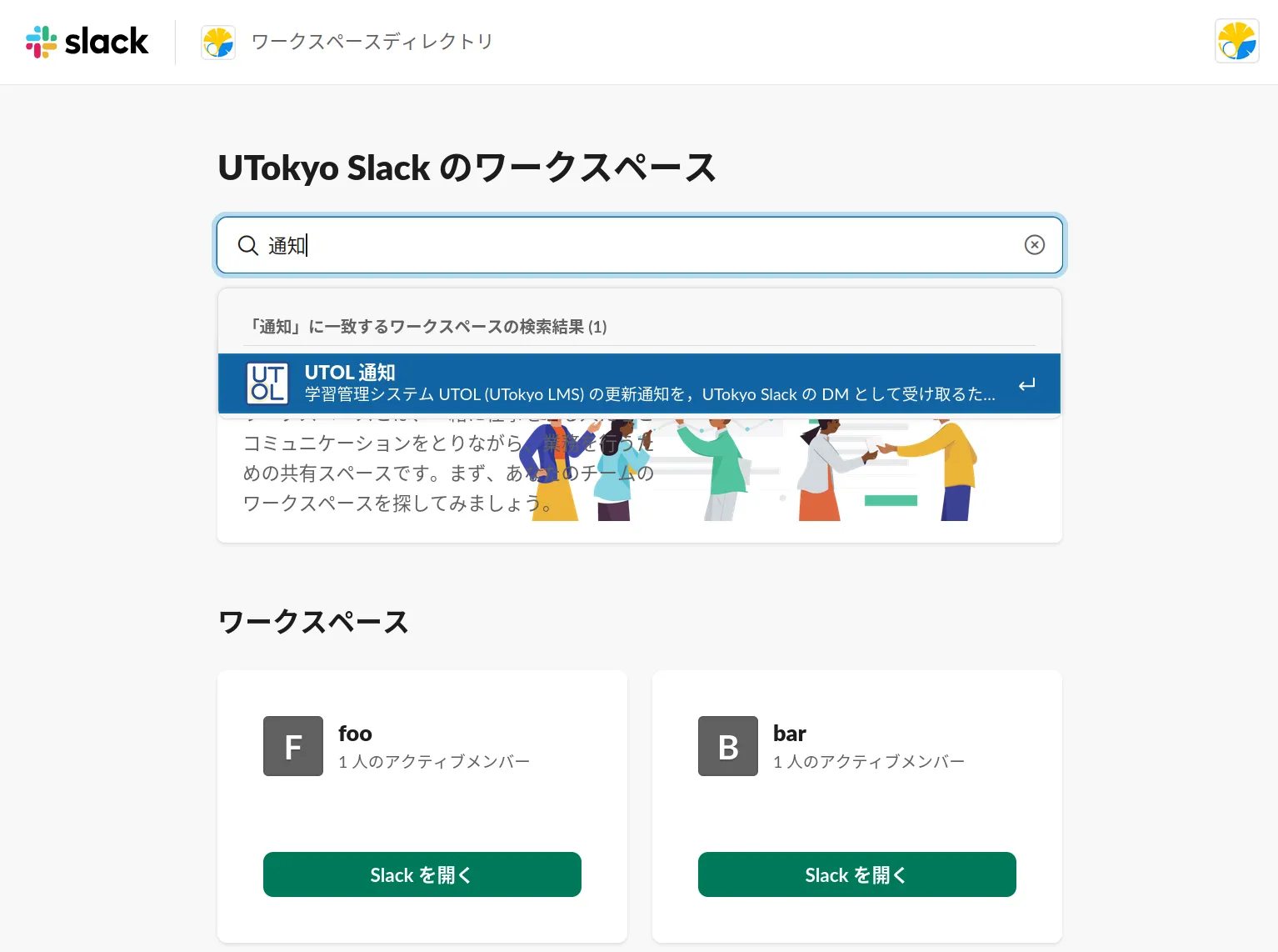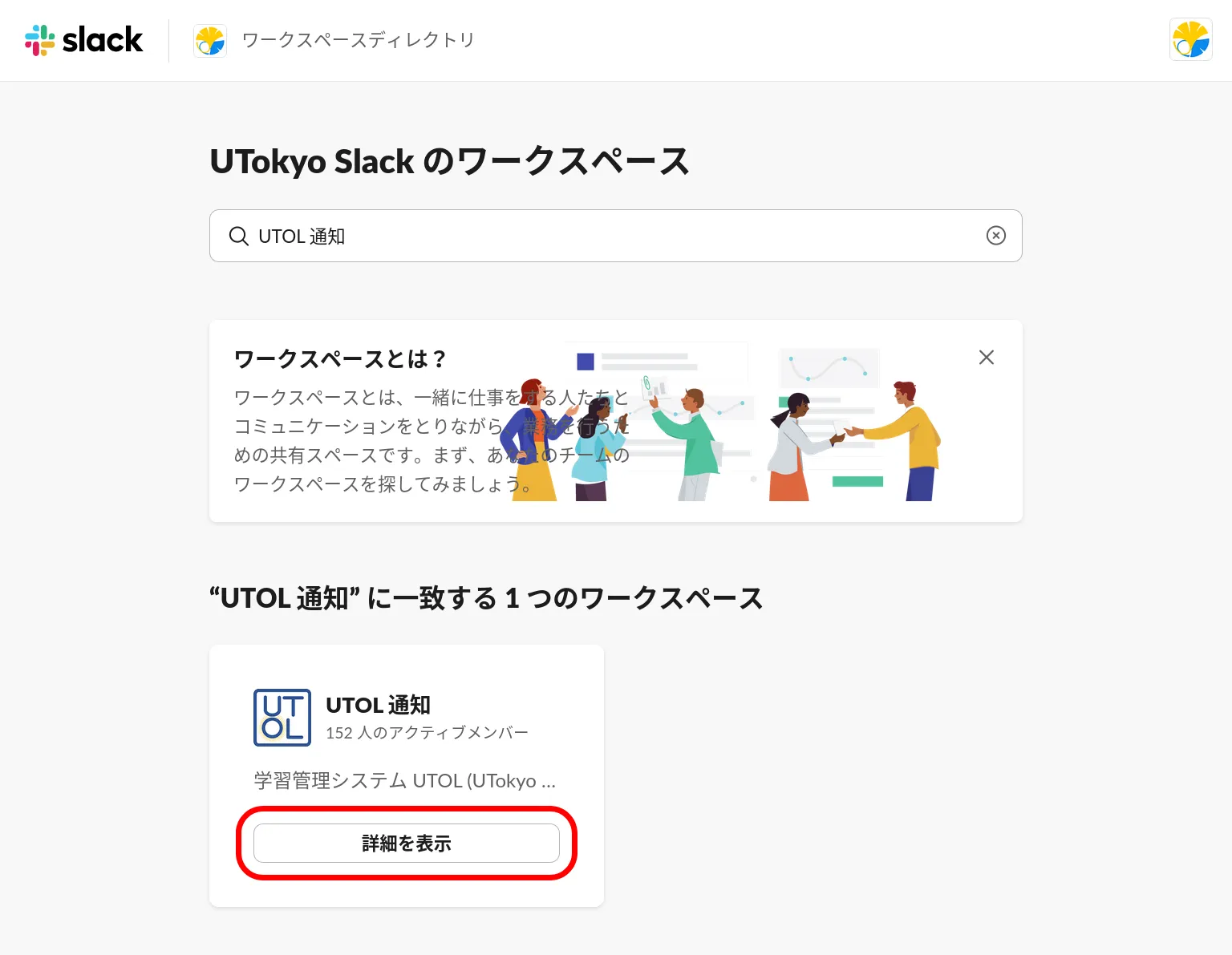 1. UTokyo Slackに自由に参加できるワークスペースの中から選んで参加する#手順」の5. までを参考に,「UTokyo Slackのワークスペース」という画面を開いてください.