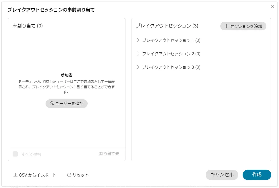 • ミーティングの作成時に「ブレイクアウトセッションの事前割当て」をクリックすると,招待した参加者を各ブレイクアウトセッションに割り当てることができます.CSVで割り当てを読み込むこともできます.