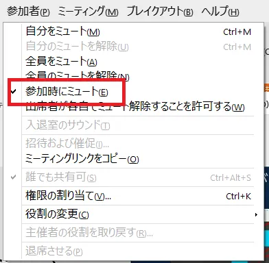 • 会議が開始されてからも,「参加者」メニューに「参加時にミュート」という機能があります.