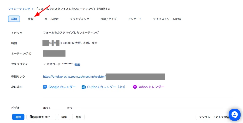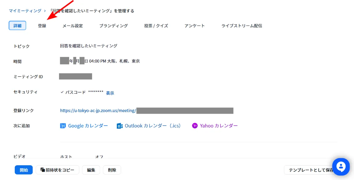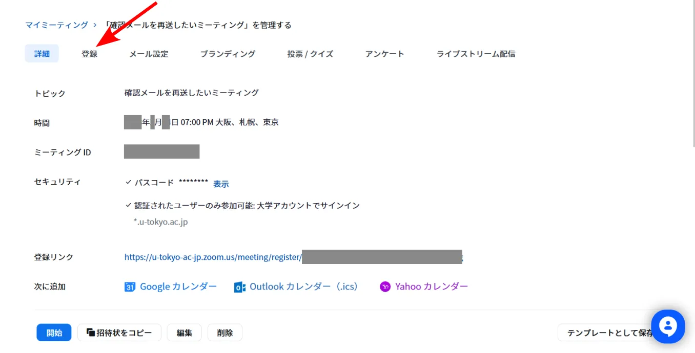 - ミーティングの情報が表示されます.上の方に「登録」「メール設定」等のタブが並んでいます.「登録」タブを選択してください.