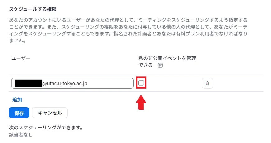- 「代替ホスト」欄に,追加対象のユーザーのUTokyo Account(数字10桁の共通ID +