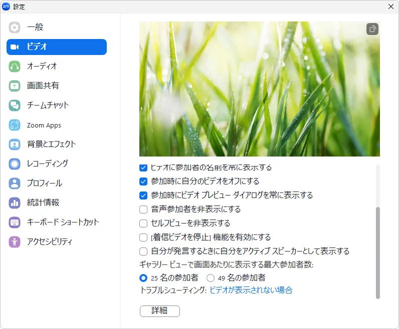 右下にある「詳細」を押し,設定の下にある「ミーティング」を押すと,表示されるミーティング設定で,様々な設定を行うことができます.ここでは,これらの設定項目のうち特に有用なものについて説明します.
